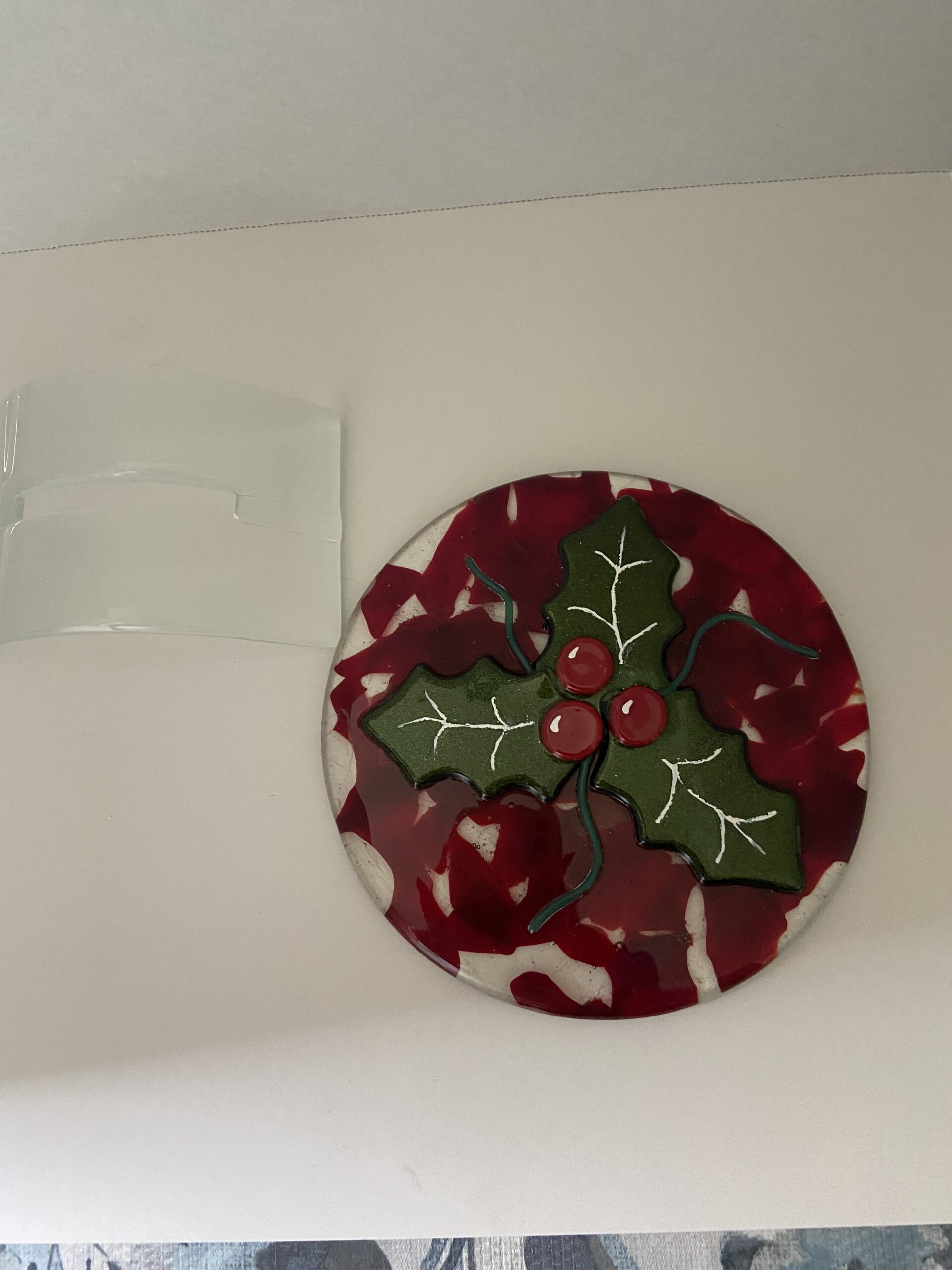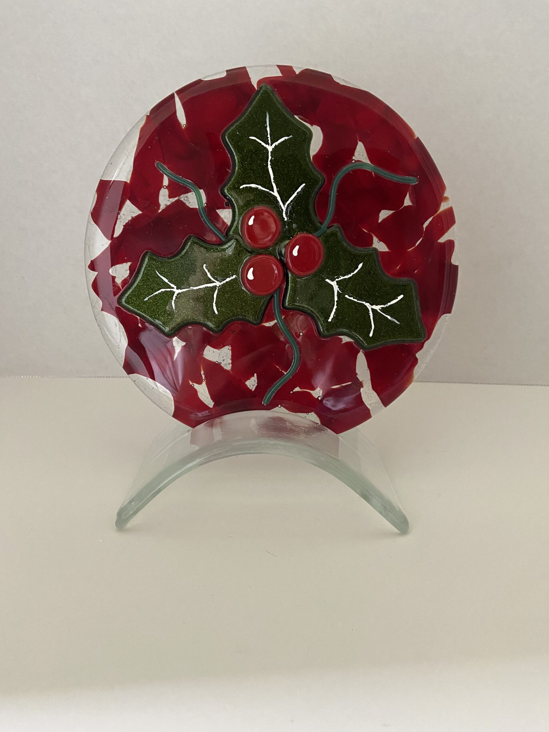 Circle of red and clear fused glass with a green holly sprig fused to the surface. Sits in a clear fused glass stand. Circle measures 7 inches in diameter. It is 7 1/2 inches tall in the stand.